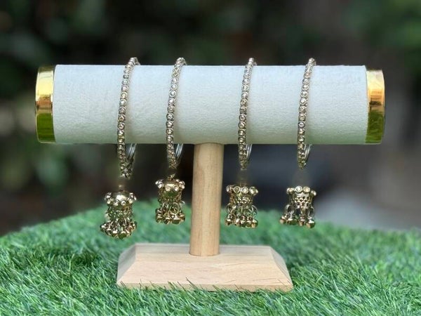 These exquisite Jhumka bangles capture the essence of royal tradition. Adorned with gold plating and intricate craftsmanship, the dangling jhumkas add a graceful movement and timeless elegance to every gesture.”